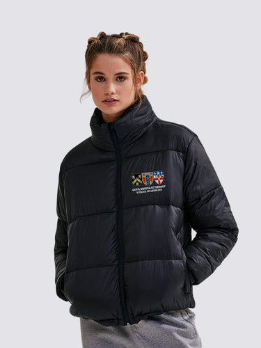 Snuggle up in style with our high-neck ladies' puffer jacket. Designed to bring warmth, structure, and confidence to cold-weather days. Its elevated silhouette and tactile finish give it a modern edge while staying true to classic collegiate style. The high collar shields from the chill, while the soft padded panels wrap you in lightweight warmth that never feels bulky.