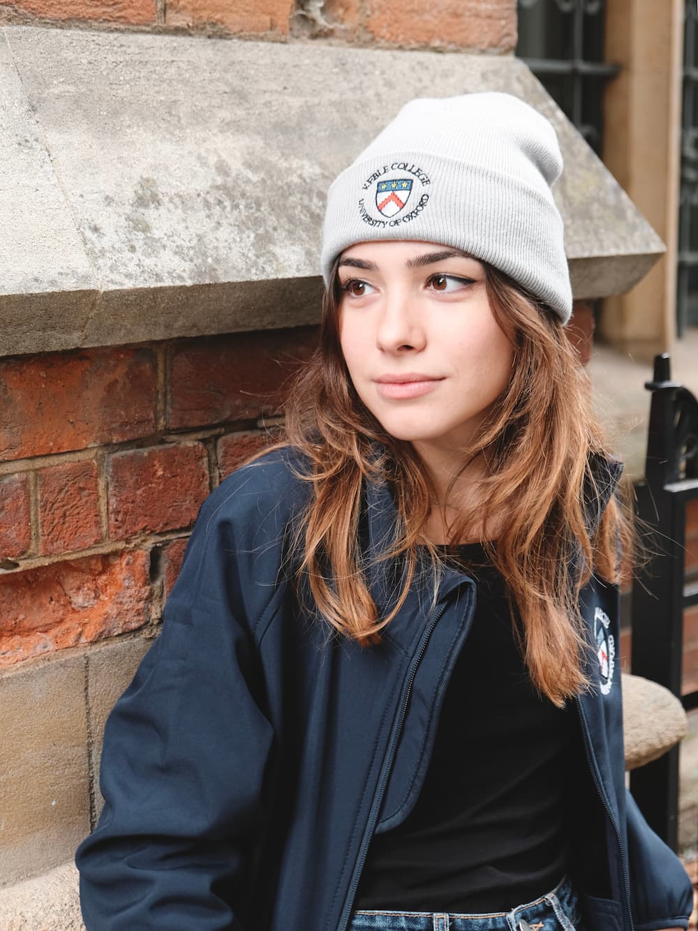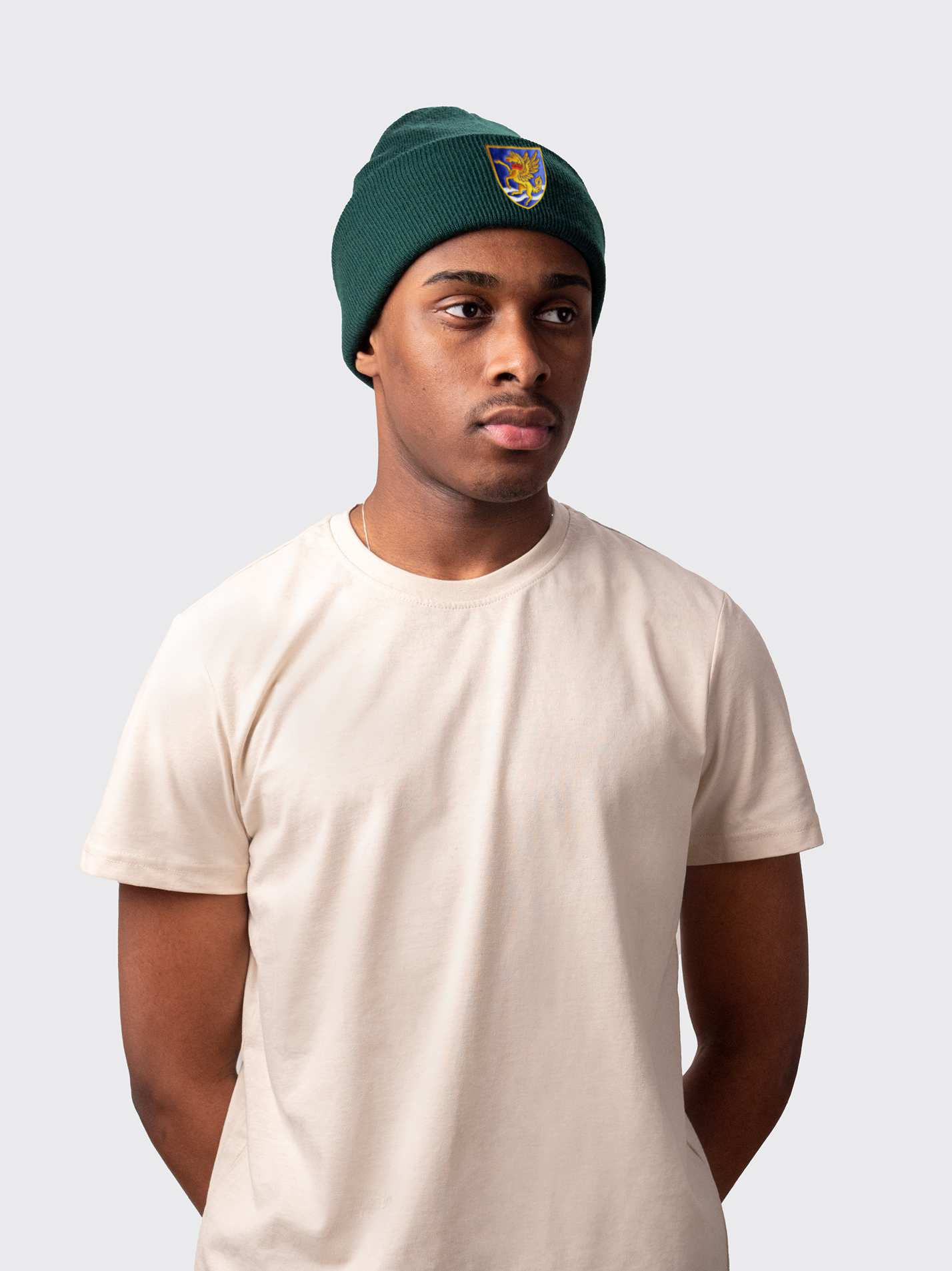 Sand beanie with Robinson College Cambridge crest, embroidered on the front